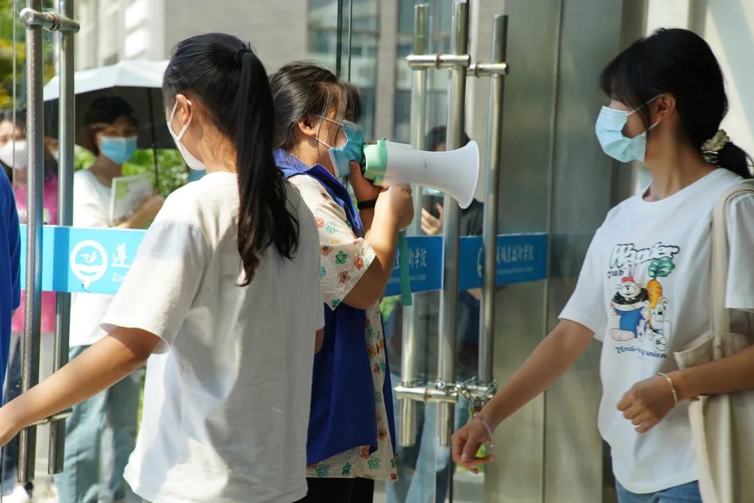 有了前几次检测的经验,学生干部条理清晰快速组织好同学们,这一次的核酸检测更加迅速、有序,十人一组间隔一米整整齐齐,余下的自动接龙静心等待,没有焦急没有不耐烦;同学们更是非常配合地自主登记,等待志愿者扫码、发放一次性采样管……