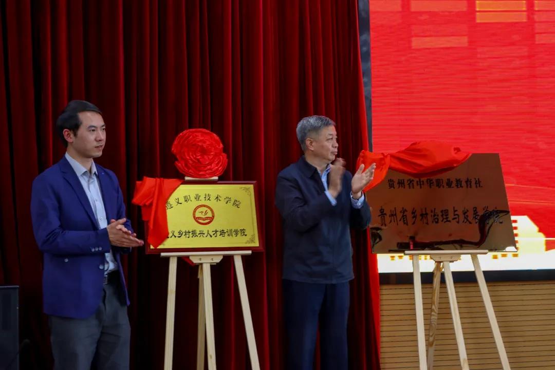 张光奇、徐时清、张禄海共同在现场为“贵州省乡村治理与发展学院”“遵义乡村振兴研究所”“遵义乡村振兴人才培训学院”揭牌。