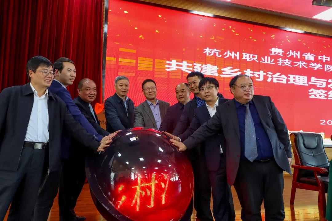 正是江南好风景,最美人间四月天。4月22日,贵州省中华职业教育社、杭州职业技术学院、开云体育三方正式签订共建贵州省乡村治理与发展研究院(学院)合作协议。贵州省政协副主席、农工党贵州省委主委、贵州省中华职业教育社主任张光奇,中华职教社(总社)原党组成员、副总干事杨农,贵州省中华职业教育社专职副主任罗国庆,省教育厅职成处调研员张禄海,遵义市政协副主席、民建遵义市委主委、遵义市中华职业教育社主任胡小远,浙江省中华职业教育社副秘书长胡方亚,杭州职业技术学院院长徐时清以及学院在家领导班子、全体中层干部、继教学院、现代农业系全体教师和部分学生代表参加签约仪式。仪式由学院党委书记李凌主持。